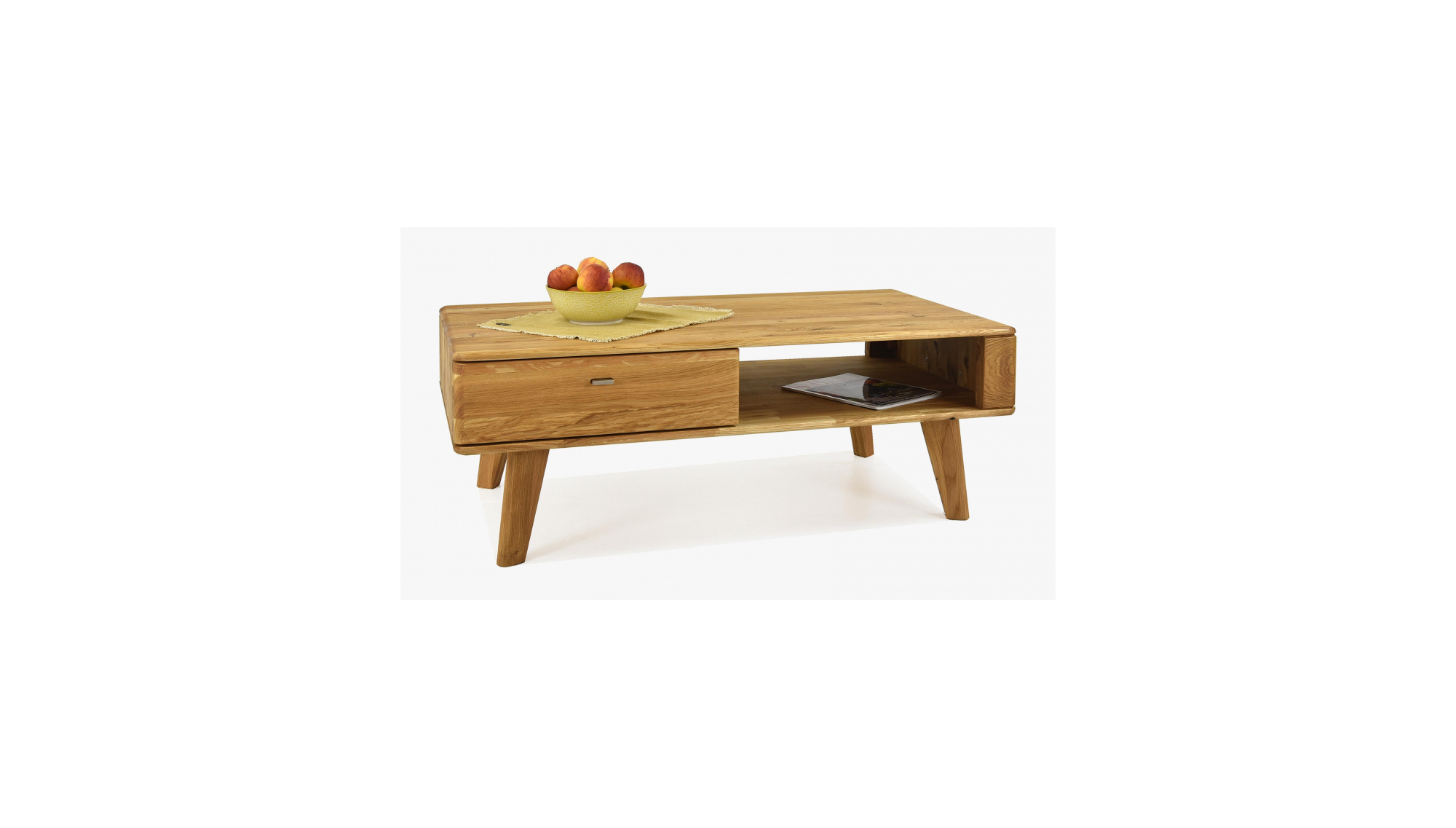 Konferenční stolek Janosik nabízí dostatečně velký úložný prostor, který oceníte při pořádání oslav. Kouzlo praktičnosti konferenčního stolku dodává prostorná a dostatečně hluboká zásuvka s tichým zasunutím a úložný otevřený prostor vedle zásuvky pod deskou stolu. I když tabulka vypadá velmi jednoduše, využijete ji naplno.