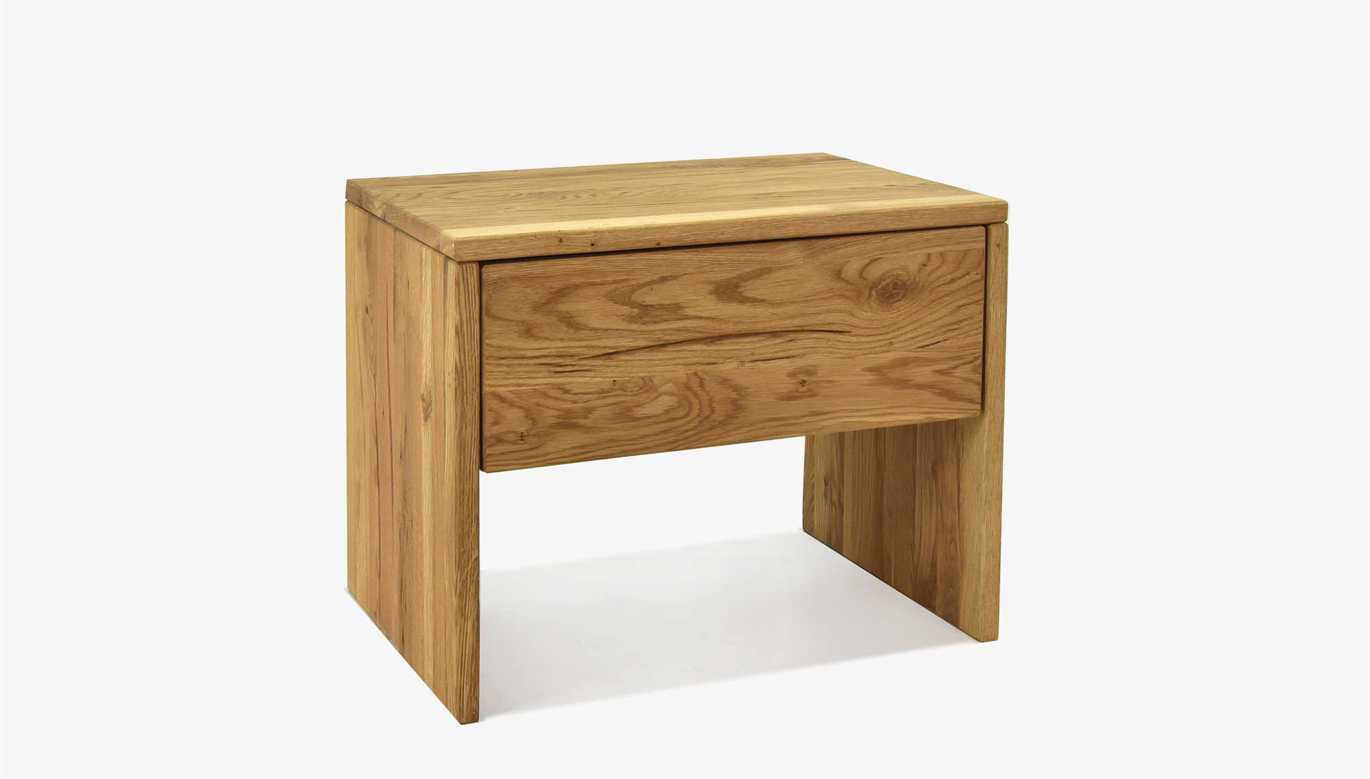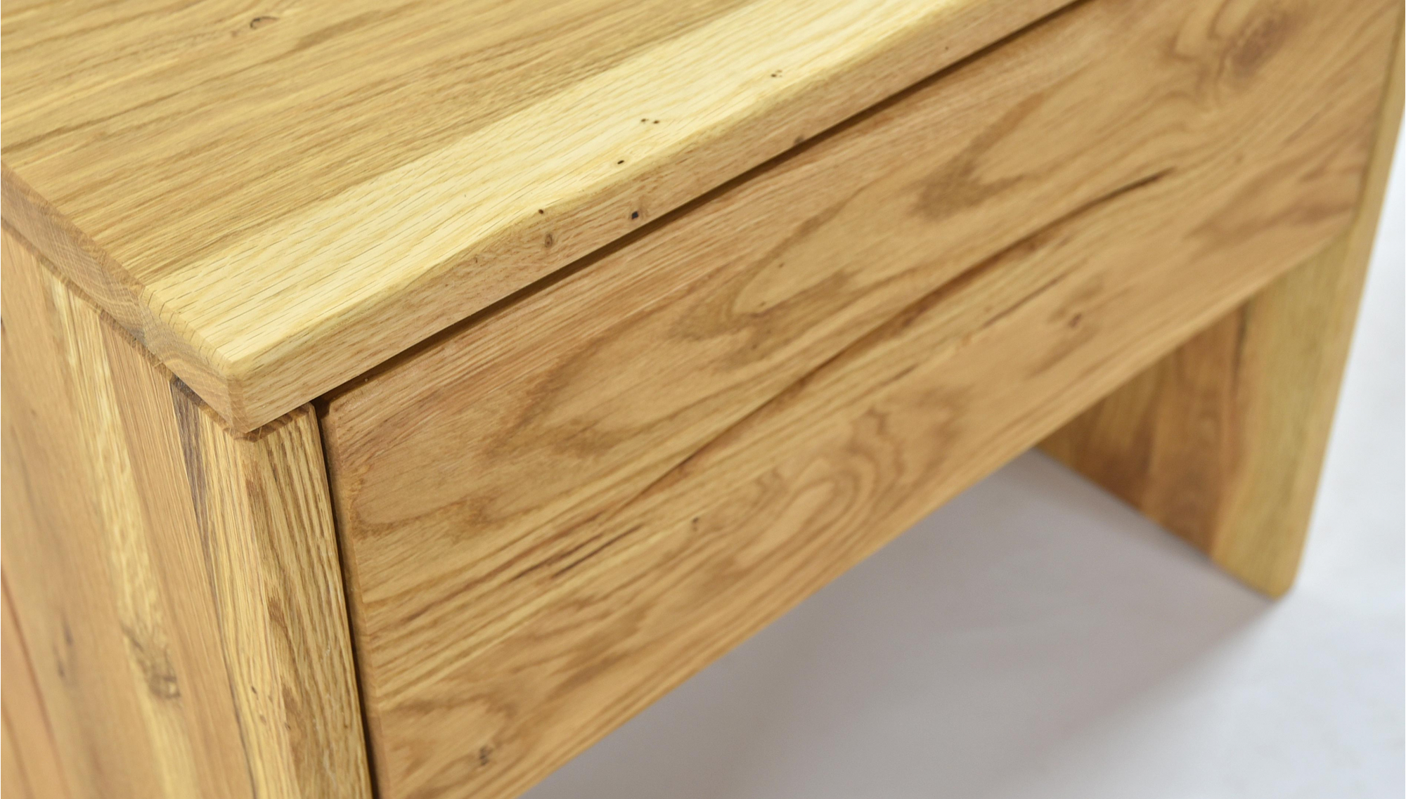Massiver Nachttisch Modell Matúš aus Eichenholz. Der Nachttisch hat eine Schublade mit Absenkautomatik. Schöne Handarbeit, bei der das Holz künstlich Risse erzeugt. Wir versuchen, ein wirklich authentisches Möbelstück zu schaffen. Der Nachttisch ist bereits montiert, kann mit einem Bett aus Eichenholz kombiniert werden. Zur Behandlung wird dänisches Öl Woca verwendet.